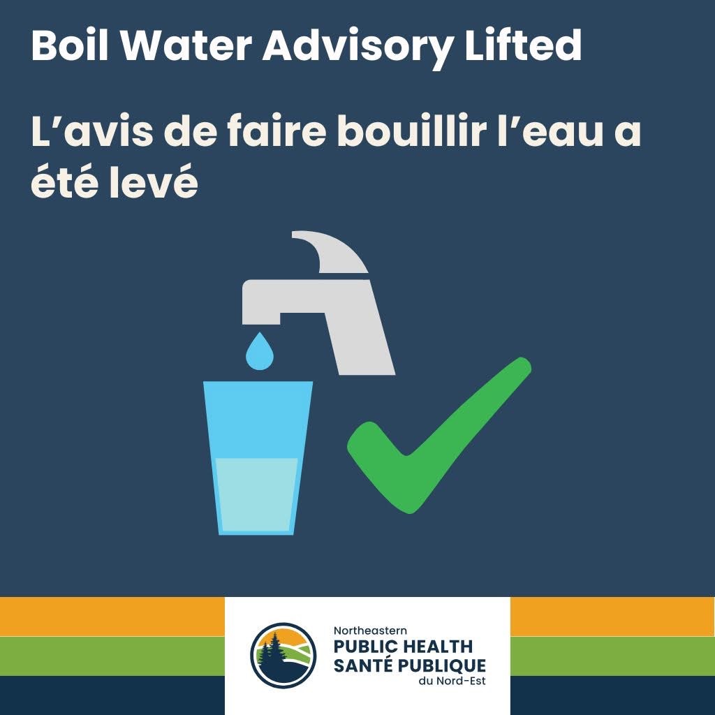 Advisory Update: The Boil Water Advisory for the Haileybury area has been lifted as of today following confirmation from Northeastern Public Health that the municipal drinking water supply is safe for normal use.